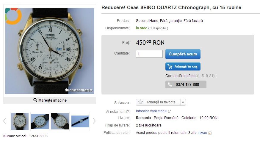 It took a few hours before it clicked, but then it dawned on me – the photos were lifted from Okazii.ro – Romania’s equivalent of eBay. Here’s the same photo (also auto re-sized to 700x679) from the Okazii.ro listing showing the water-marks: Once I knew where to look, it didn’t take me long to find the listing (since amended twice and now ended):
