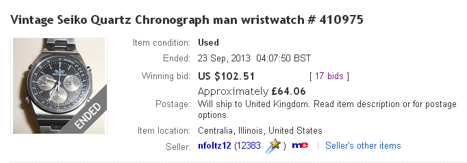 Nice old Seiko Quartz Chronograph mans wristwatch. This is in nice condition but needs a new battery. The back is numbered 410975. I will gladly combine items to save postage fees. NO RESERVE ON THIS ITEM .... The description went on and on, but the above is all that's relevant to the watch. It sold for $102.51 (approx. £64) after 17 bids. The auction received 185 views over the 7-day listing period.