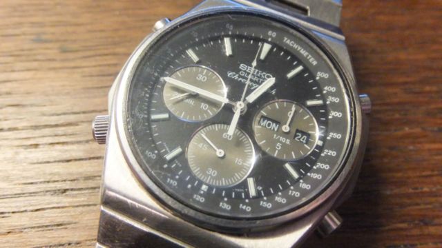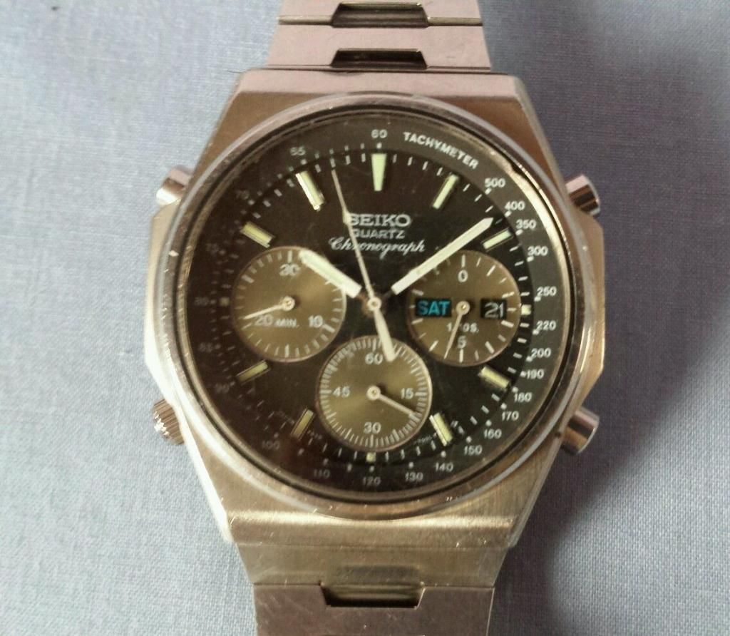 This one listed by a US eBay seller didn't look too clever in his first close-up photo, Apart from the scratched crystal, the lume on the hands and batons is badly discoloured, plus the chrome is peeling away from the sub-dial rims. Moisture, battery leakage or both ? http://www.ebay.co.uk/itm/360740214325 Vintage Seiko Quartz Chronograph man wristwatch # 410975