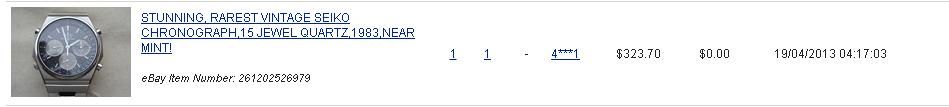 SEIKO - CHRONOGRAPH Herrenarmbanduhr QUARTZ schöner Zustand (siehe Fotos) Werk Funktioniert (Ganggenauigkeit nicht geprüft), Uhr ohne Batterie Durchmesser ohne Krone: ca. 40 mm Höhe: ca 10,5 mm Although, compared to the previous, this seller included a full set of photos, he omitted any mention of 7A38 in title and description. The auction ended on 15th March, 2012 around 7:00pm, yet by dint of what might be construed as shill bidding, this potentially lesser example achieved a slightly better price - 90.66 Euros (approx £75.29) after 20 bids by 11 bidders. Unfortuately 6 of the late-placed bids were made by a bidder whose ID shows as a***n, with a feedback rating of (-1) ! See: http://offer.ebay.co.uk/ws/eBayISAPI.dll?ViewBids&_trksid=p4340.l2565&rt=nc&item=110835752257 | |