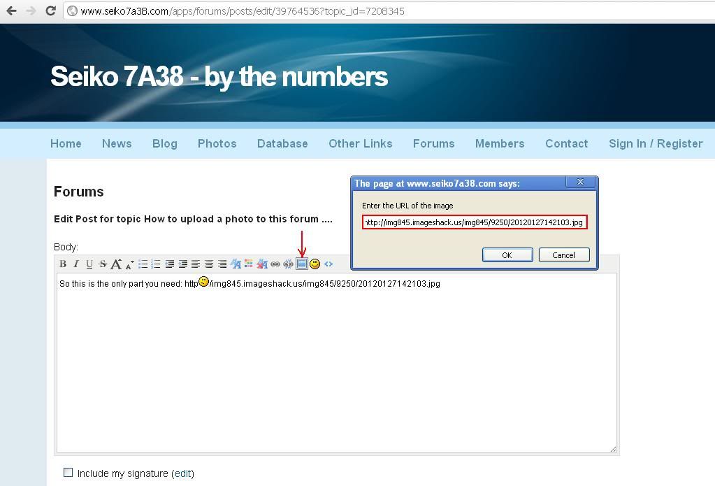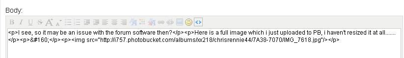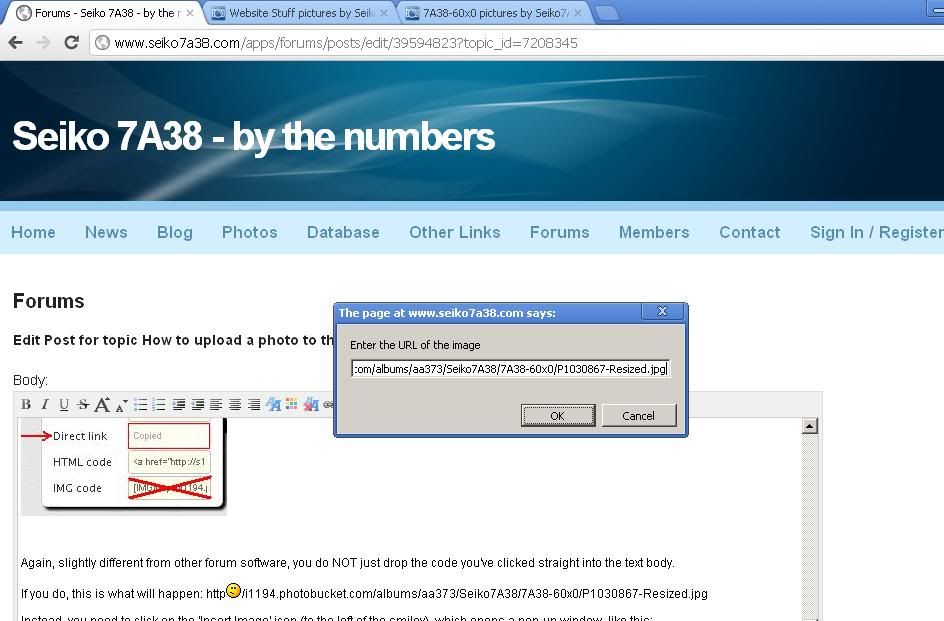 Again, slightly different from other forum software, you do NOT just drop the code you've clicked straight into the text body. If you do, this is what will happen: http://i1194.photobucket.com/albums/aa373/Seiko7A38/7A38-60x0/P1030867-Resized.jpg Instead, you need to click on the 'Insert Image' icon (to the left of the smiley), which opens a pop-up window, like this: