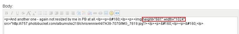 Chris. I've just re-edited my previous post. I have re-inserted your second photo using the normal PB coding without height="681" width="1024" I don't know what it is (if anything) you are doing differently (when the image width gets compressed). This thread was originally intended to be an instructional topic, rather than the fault-finding exercise which it has turned into today. I don't have an immediate simple answer to your problem and I suspect that I won't get any help from Webs (total lack of) Support. May I suggest, if you see a recurrence of the problem, you take the following action. You have a 10 minute editing time out window: 1) Click on 'Edit' underneath your post. Click on the < > (HTML coding) arrows to the right of the insert Smileys icon. 2) Remove the offending height="681" width="1024" coding between < img and src (but leave a gap between them). 3) Submit your changes. If you (or any one else encountering it) fail to manage to correct the problem, then flag your post and I'll sort it out for you. O.K. ? | |