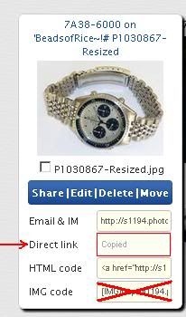 Most of you have already written posts on other watch forums including remotely-hosted embedded photo images. It's not difficult on this forum either - just slightly different (in the coding you use, and how you actually do it). First of all, if you haven't already got one, you'll need to open a photo hosting account on Flickr, ImageShack or Photobucket. I've used all three at various times but for ease of use I'd recommend Photobucket. You'll need to upload your photos first. Here's a screen-print of one of my Photobucket sub-albums I've been using earlier today: