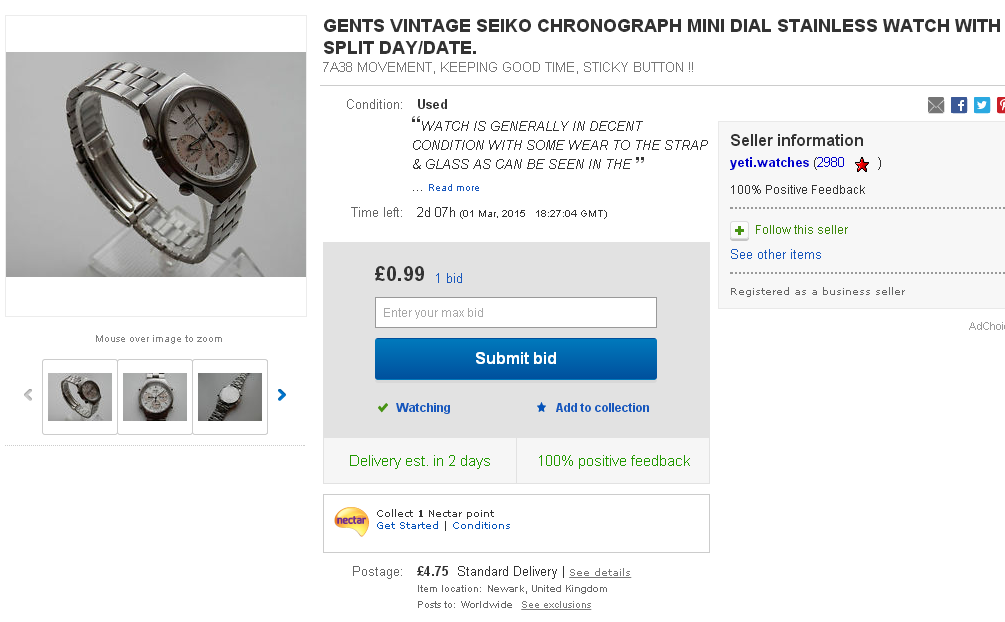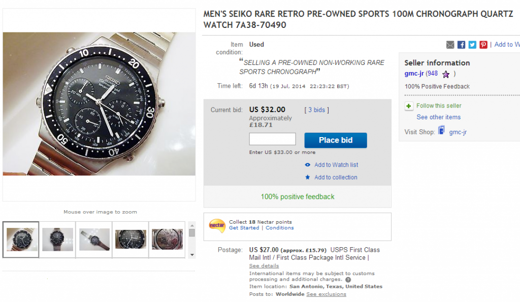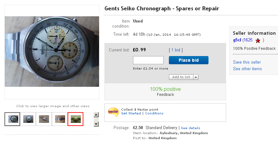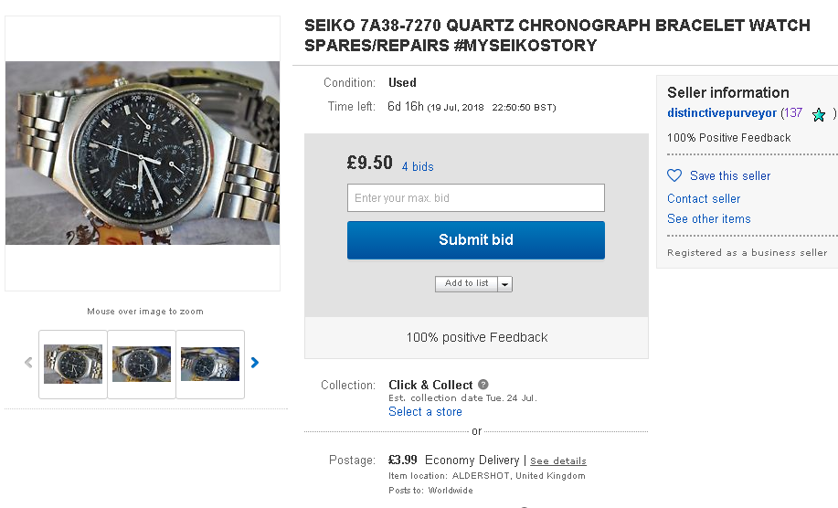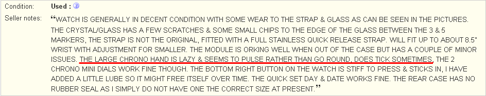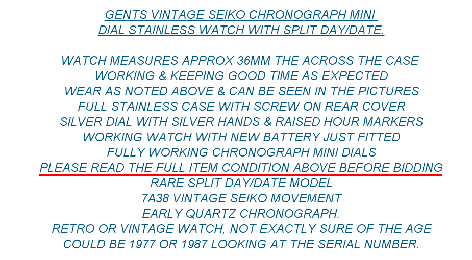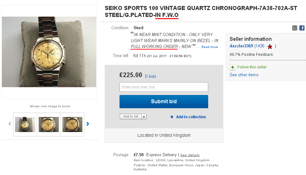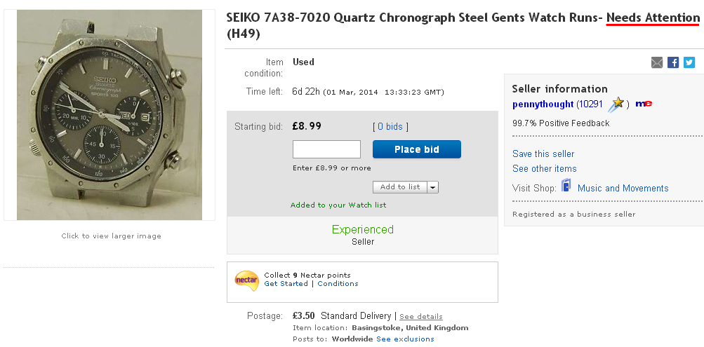 There are some downright incompetent cowboys on eBay lately. His description starts off: This is a seriously handsome example of this classic timepiece. I wore it for the day to make sure it all works okay and had several comments from colleagues as it stands out so much.