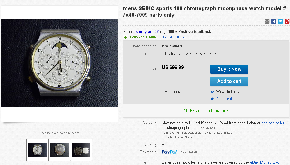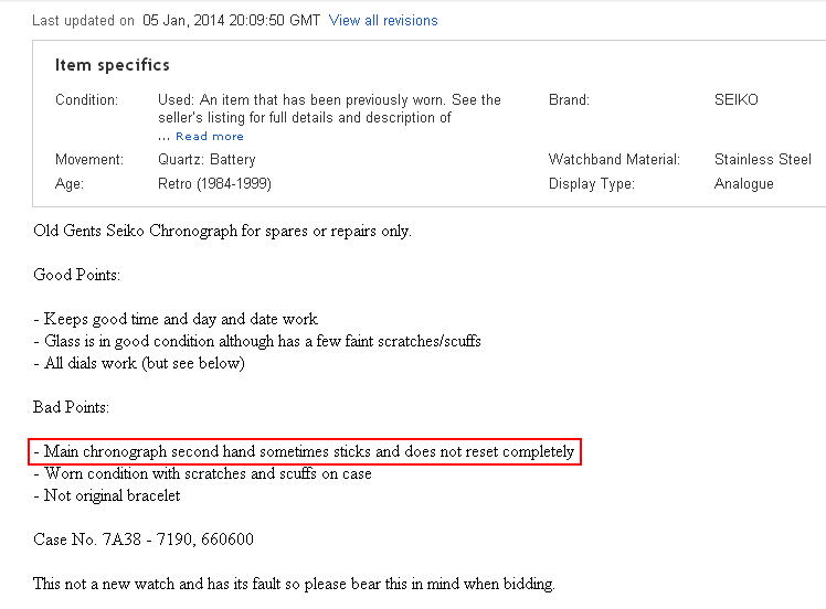 The gross incompetence, ignorance and laziness of some eBay sellers dealing specifically in watches never ceases to amaze me. Take this dog-eared stainless 7A38-7190 with badly stained sub-dials, fitted with a non-original replacement bracelet, listed yesterday by UK eBay seller yeti.watches - whose less-than-stellar offerings have previously featured in threads in the eBay section. The reason I'm tacking it onto this thread will soon become apparent. http://www.ebay.co.uk/itm/351326866650